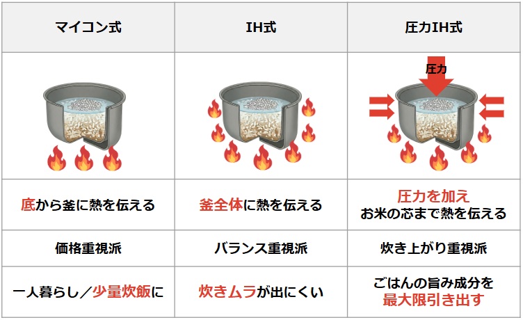 1-1. 加熱方式の違い:マイコン式・IH式・圧力IH式とは 炊飯器の加熱方式によって、美味しさも変わる! |