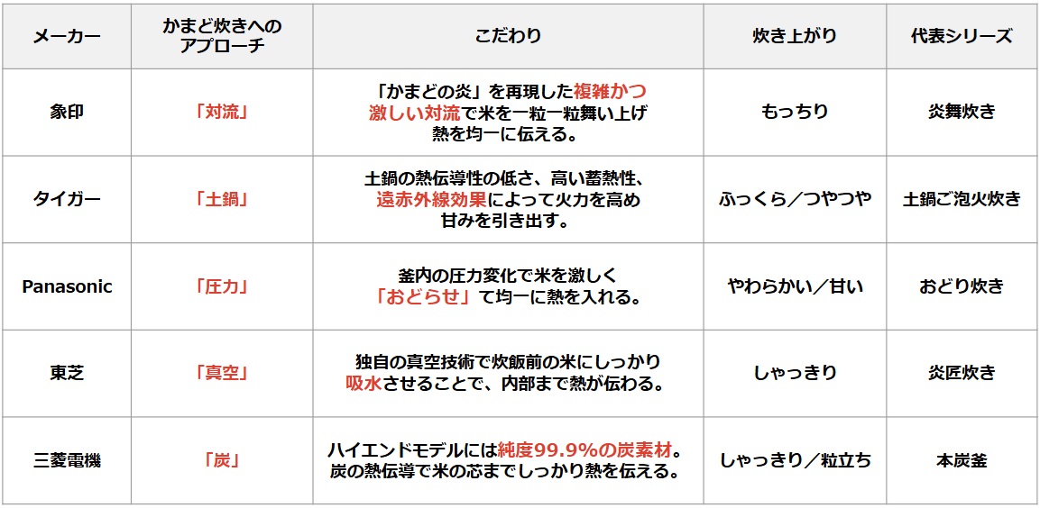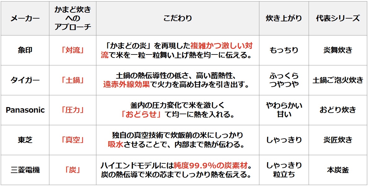 1-2. 主要メーカーのこだわり:「かまど炊き」へのアプローチ メーカーのこだわりを見れば、自分の好みに合わせた炊飯器が選べる! |